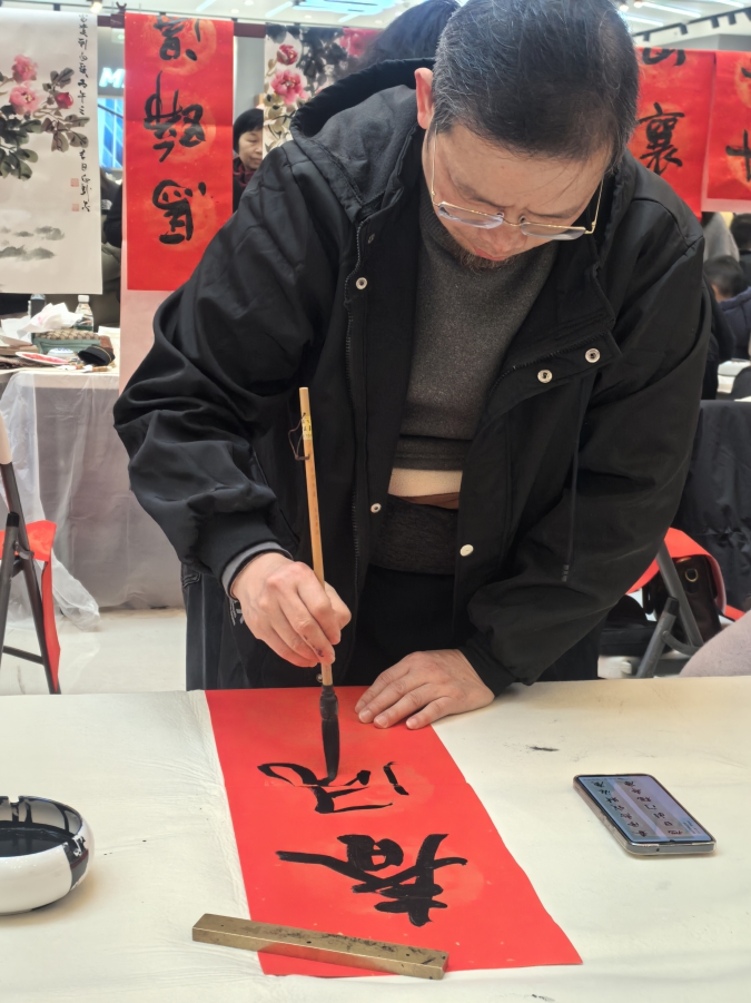 本次活動的嘉賓陣容堪稱豪華。中國書法家協會會員、湖北省硬筆書法家協會主席柳長忠親臨現場,他的筆下行雲流水,一幅“門迎百福福星照,戶納千祥祥雲開”贏得滿堂喝彩。中國書法家協會會員、荊州市書法家協會名譽主席吳中華也欣然提筆,為市民書寫定製春聯。此外,湖北省政協書畫院院務委員、畫家白駿,湖北省硬筆書法家協會副主席楊長保、副監事長徐兢、副秘書長史家順,湖北省硬筆書法家協會主席團委員、湖北省書畫家協會荊州分會會長王瑩輝等專家均現場獻藝,將最真摯的新春祝福凝聚於筆墨之間。
